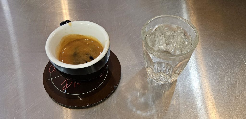 Le café est accompagné d’un verre d’eau gazeuse. La créma est restée fine .